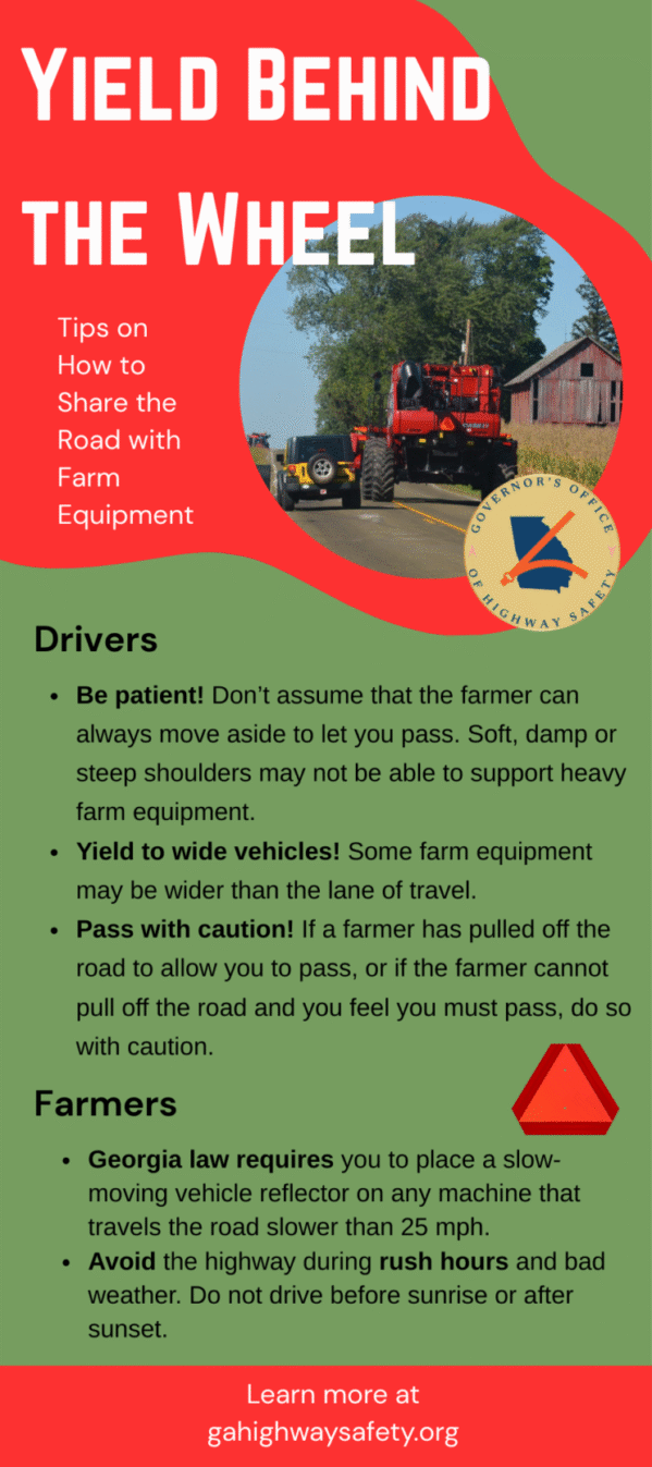 In Georgia, drivers must yield to slow-moving farm equipment to ensure everyone’s safety on rural roads. Tractors and other agricultural vehicles often travel well below the posted speed limit.